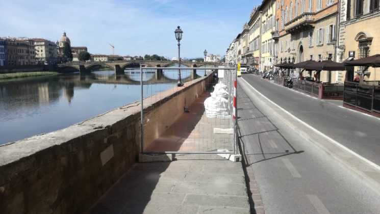 In Lungarno Corsini, invece gli interventi in corso con il cantiere che interrompe un tratto del marciapiede servono a ricostruire la cimasa, evidentemente danneggiata e instabile della spalletta che si affaccia proprio sul Ponte Vecchio.