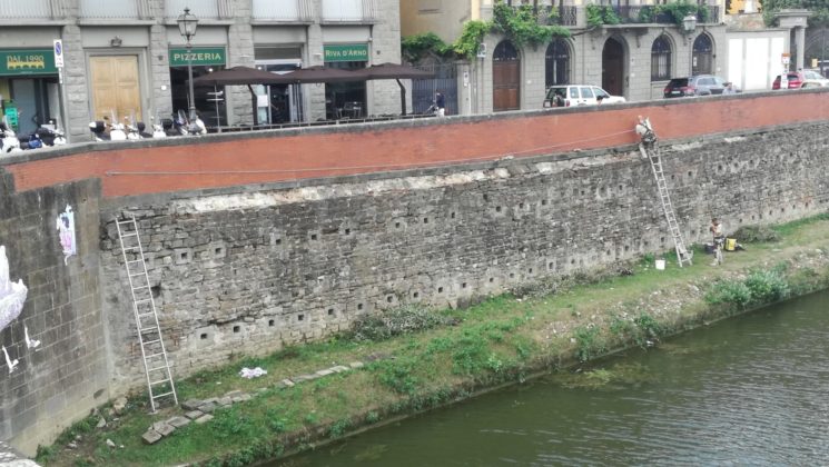 Sempre con gli operatori su corda, dopo gli interventi sulle piante, si è provveduto in questi giorni in Lungarno Soderini alla sistemazione delle pietre di congiunzione della spalletta rialzata dopo l’alluvione del ’66 con il muro di sponda, forse uno dei tratti più antichi considerato che sono ancora ben visibili le “buche pontaie” realizzate per la sua costruzione.