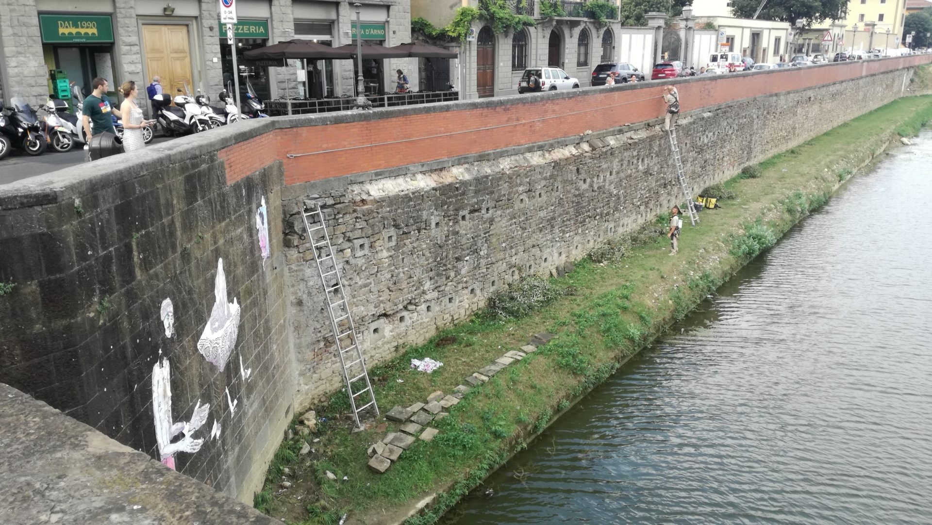 Sempre con gli operatori su corda, dopo gli interventi sulle piante, si è provveduto in questi giorni in Lungarno Soderini alla sistemazione delle pietre di congiunzione della spalletta rialzata dopo l’alluvione del ’66 con il muro di sponda, forse uno dei tratti più antichi considerato che sono ancora ben visibili le “buche pontaie” realizzate per la sua costruzione.