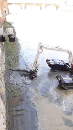E così, approfittando della stagione estiva in cui i livelli delle acque sono generalmente più bassi, si procederà grazie allo speciale mezzo d’opera alla rimozione di tutti i sedimenti fluviali appoggiatisi sulle banchine di destra e sinistra idraulica a valle del Ponte Vecchio fino alla pescaia di Santa Rosa. Un’operazione resasi necessaria dal fatto che la manutenzione, finora operata con operatori manuali trasportati su questi stretti lembi di terra solo con barche e gommoni, si faceva via via sempre più complessa, onerosa e rischiosa considerato la natura totalmente instabile dei sedimenti pieni di buche, sconscendimenti e irregolarità varie.