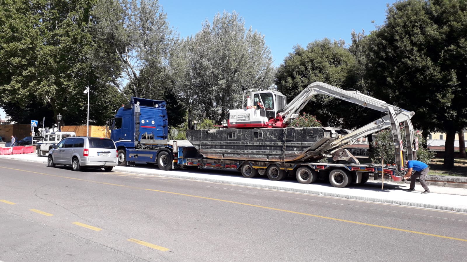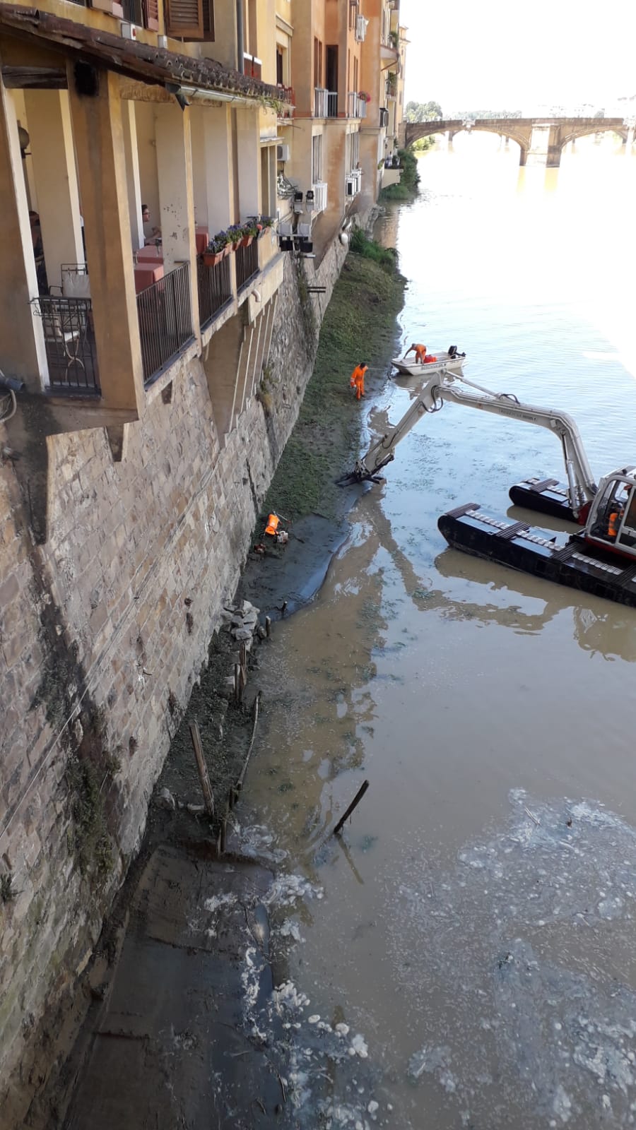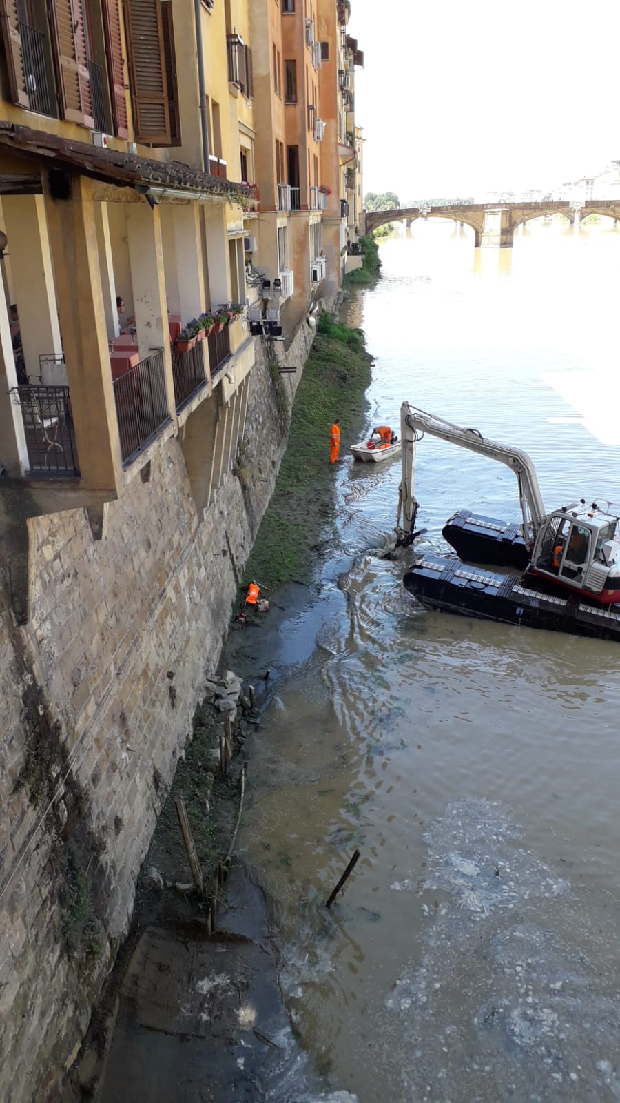 E così, approfittando della stagione estiva in cui i livelli delle acque sono generalmente più bassi, si procederà grazie allo speciale mezzo d’opera alla rimozione di tutti i sedimenti fluviali appoggiatisi sulle banchine di destra e sinistra idraulica a valle del Ponte Vecchio fino alla pescaia di Santa Rosa. Un’operazione resasi necessaria dal fatto che la manutenzione, finora operata con operatori manuali trasportati su questi stretti lembi di terra solo con barche e gommoni, si faceva via via sempre più complessa, onerosa e rischiosa considerato la natura totalmente instabile dei sedimenti pieni di buche, sconscendimenti e irregolarità varie.