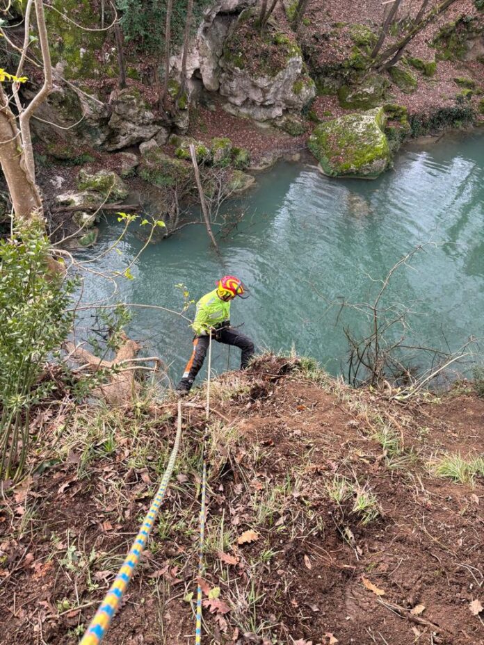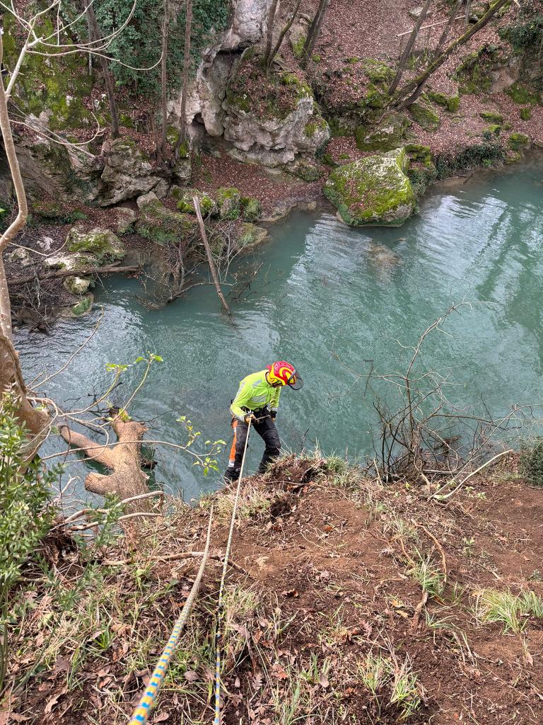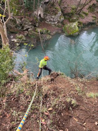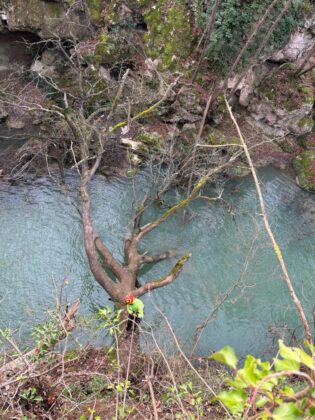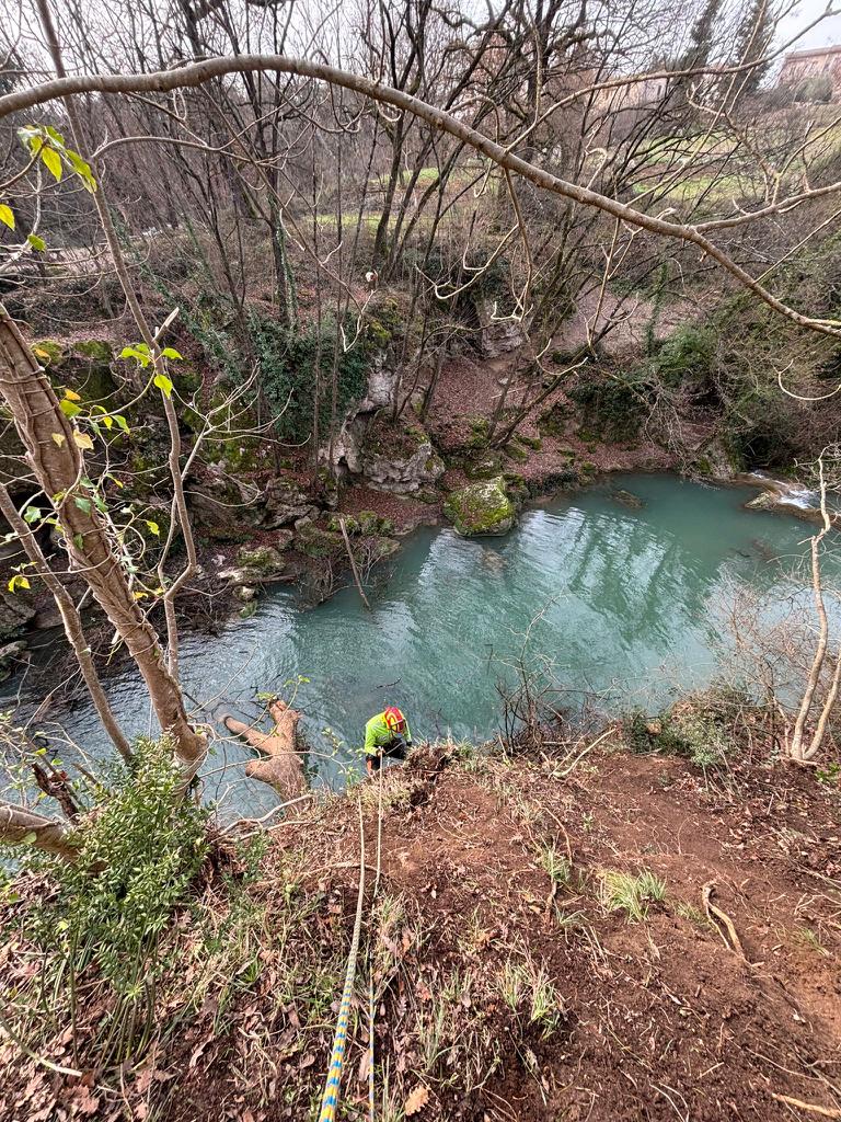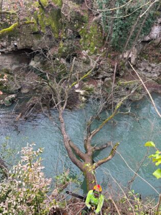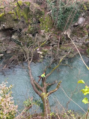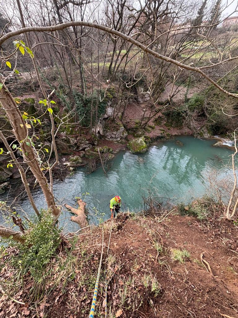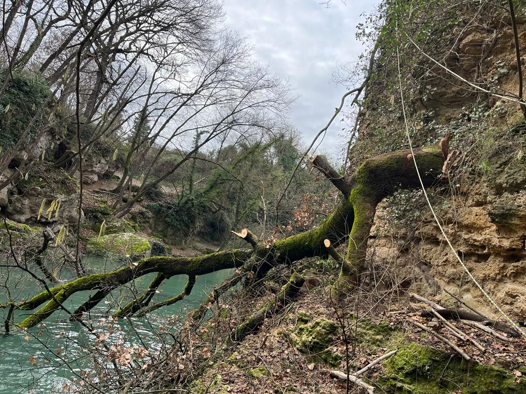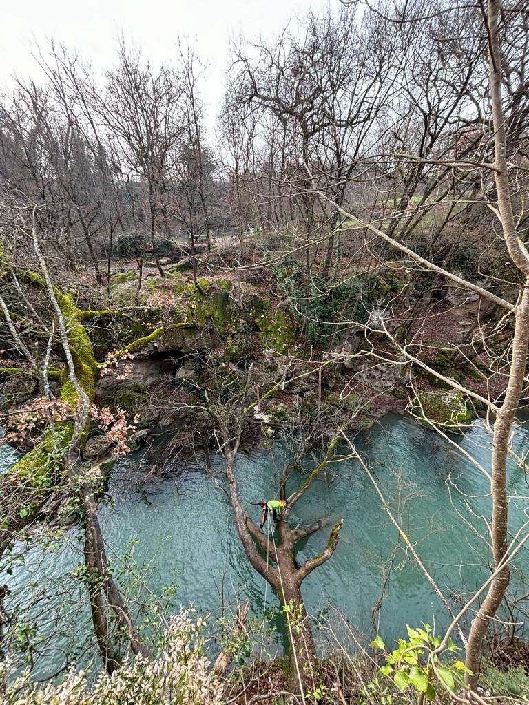 A lavoro con i tree climbers per la rimozione delle piante cadute e il diradamento selettivo delle piante più critiche con particolare cura e attenzione al rispetto dello spettacolare paesaggio fluviale dell’Alta Valle del Fiume Elsa