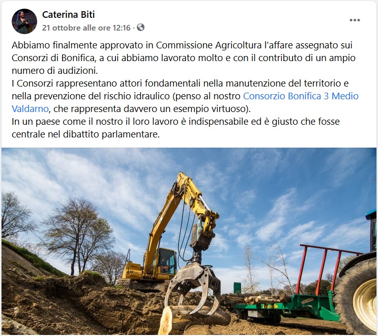 “Abbiamo finalmente approvato in Commissione Agricoltura l’affare assegnato sui Consorzi di Bonifica, a cui abbiamo lavorato molto e con il contributo di un ampio numero di audizioni. I Consorzi rappresentano attori fondamentali nella manutenzione del territorio e nella prevenzione del rischio idraulico (penso al nostro Consorzio Bonifica 3 Medio Valdarno, che rappresenta davvero un esempio virtuoso). In un paese come il nostro il loro lavoro è indispensabile ed è giusto che fosse centrale nel dibattito parlamentare” queste le parole con cui la senatrice fiorentina Caterina Biti, sulla propria pagina Facebook, ha voluto rendere conto del lavoro della Commissione Agricoltura del Senato, di cui è membro.