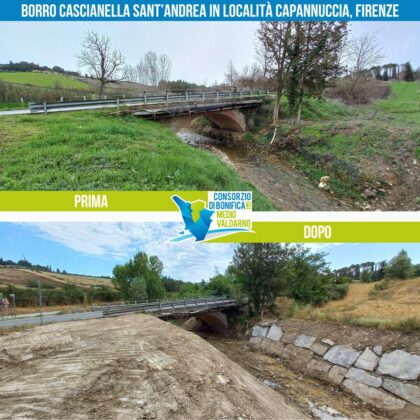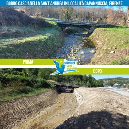 Sul Borro Cascianella Sant’Andrea in località Capannuccia si è invece provveduto alla ricalibratura del corso d’acqua con allargamento della sezione presso il ponte delle SP56 e realizzazione di difese spondali a monte e valle del ponte.