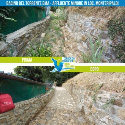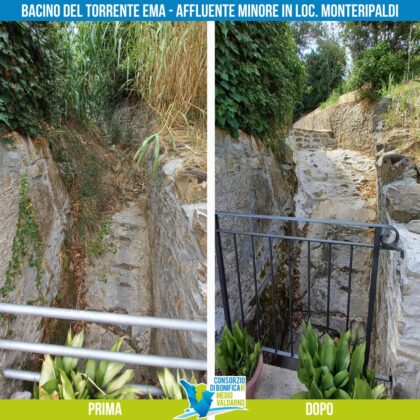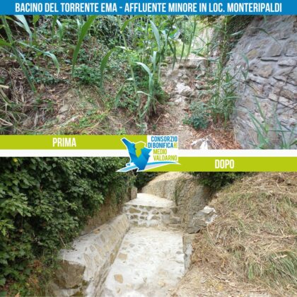 Si è cominciato in Località Monteripaldi, dove su un corso d’acqua minore si è effettuato un taglio straordinario della vegetazione, la rimozione dei sedimenti accumulati in alveo e il corazzamento del fondo per arrestare l’erosione che stava mettendo a rischio le murature di difesa idraulica laterali.