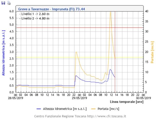 Dal sopralluogo effettuato poi a seguito dell’evento meteo i tecnici del Consorzio hanno potuto verificare che la cassa di espansione a monte dell’abitato, zona Tiratoio-Stadio è arrivata al limite massimo prima di cominciare ad invasare, la piena ha attraversato il centro abitato, appena sfalciato, passando molto alta ma senza alcun problema mentre in zona Via Colognole ha lambito il nuovo argine ed ha potuto godere della sezione di alveo appena risagomata e ampliata grazie ad un recente intervento che il Consorzio ha concluso solo pochi mesi fa. Più a valle tutte le casse di espansione lungo la Via Grevigiana né sono entrate in funzione né hanno registrato sollecitazioni di rilievo mentre a Tavarnuzze le due ondate sono state registrate dagli idrometri e osservate dagli abitanti senza alcuna preoccupazione.