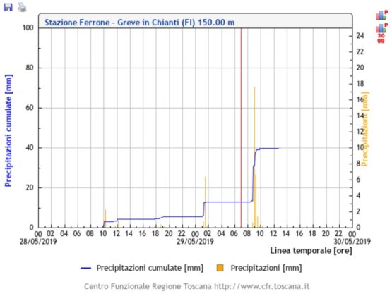Il mese di maggio più piovoso degli ultimi anni ha concluso i suoi giorni con una serie di temporali di forte intensità e limitata concentrazione nel tempo che si sono abbattuti nei giorni scorsi sulla zona di Greve in Chianti, dapprima nella serata di martedì 28 a monte del capoluogo e la mattina successiva a valle nella zona del Passo dei Pecorai – Ferrone.