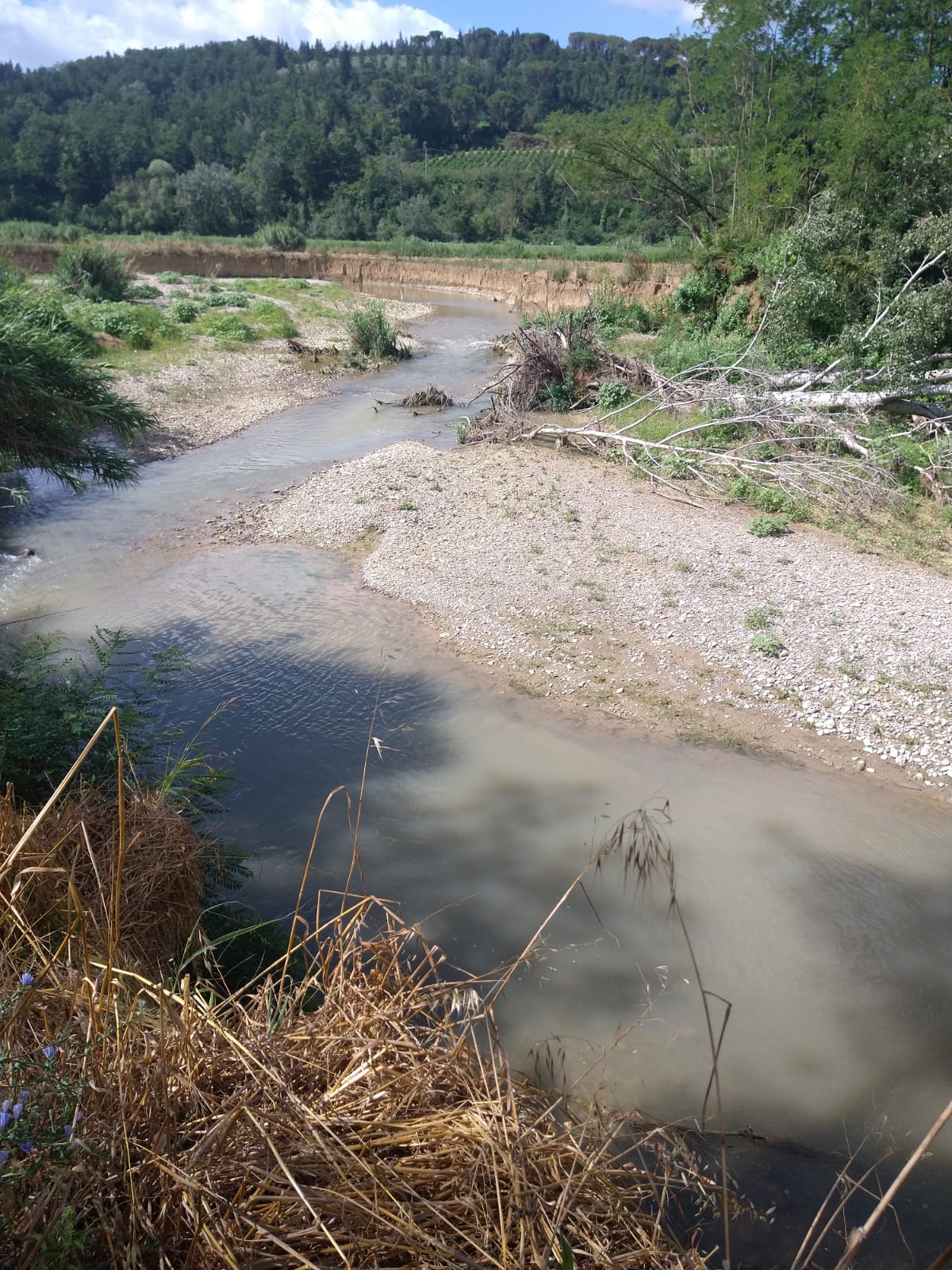La Pesa, ormai lo sappiamo fin troppo bene, ha un marcato regime torrentizio: di questi tempi, in estate, come di consueto purtroppo, sta per un lungo periodo quasi completamente asciutta in tutta la bassa valle e in particolare nel tratto finale di Montelupo Fiorentino; le uniche speranze sono legate all’andamento dei prelievi per uso umano, alla stagione più o meno siccitosa e a qualche temporale estivo che possa prolungare più possibile il deflusso minimo vitale. D’inverno invece non mancano le grandi piene, mitigate da un effetto di laminazione lineare continua che si realizza grazie allo spazio lasciato liber tra l’alveo e il percorso di servizio ma che in alcuni tratti, specie tra Cerbaia, San Vincenzo e Ginestra Fiorentina può determinare grandi divagazioni con zone di forte erosione ed altre di abbondante deposito di sassi e ghiaie.