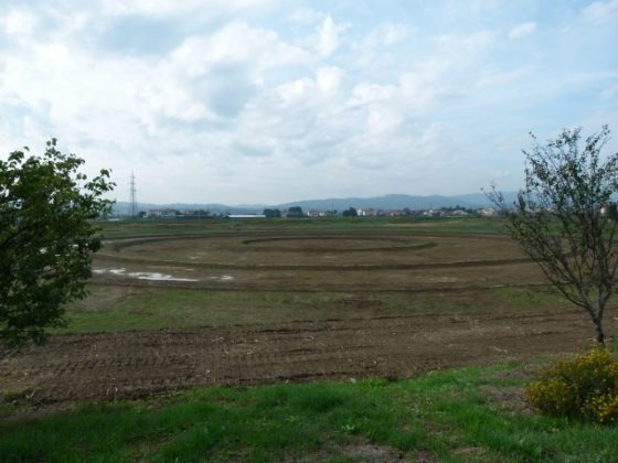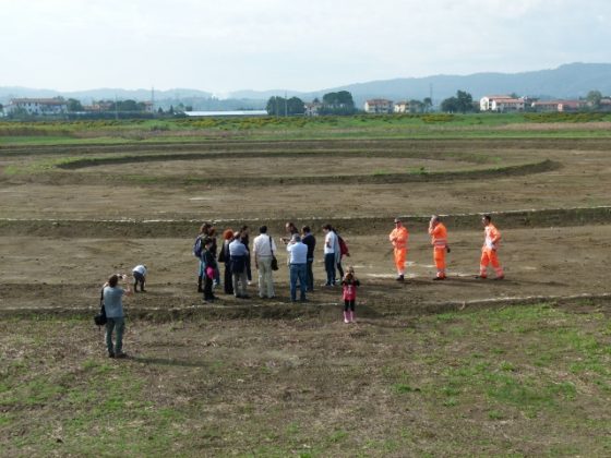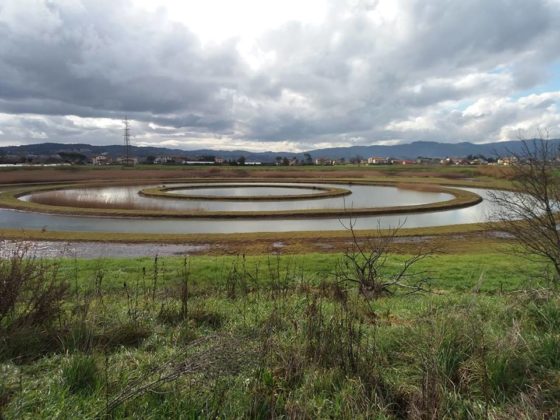 Con le piogge molto abbondanti dei giorni scorsi, concentrate per quanto riguarda il Medio Valdarno sui bacini dell’Ombrone Pistoiese e del Bisenzio, si sono riempiti anche i cerchi concentrici che si trovano all’interno della cassa di espansione di Olmetti a Campi Bisenzio (FI). Ideati nell’ambito del progetto #Artlands a cura di Carlo Scoccianti, questi disegni in terra che si trovano nella zona più bassa e più umida al centro dell’area destinata ad accogliere le acque di piena per la sicurezza idraulica del territorio, sono stati realizzati grazie alla maestria degli operatori di macchina del Consorzio di Bonifica 3 Medio Valdarno. Un paesaggio che dunque lega, mischia e confonde l’arte con la difesa del suolo, la campagna con la città circostante, la natura con il territorio fortemente infrastrutturato e antropizzato dei dintorni.