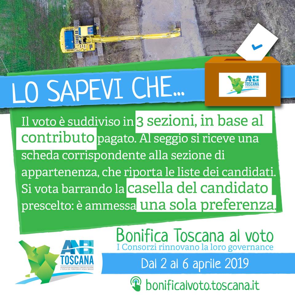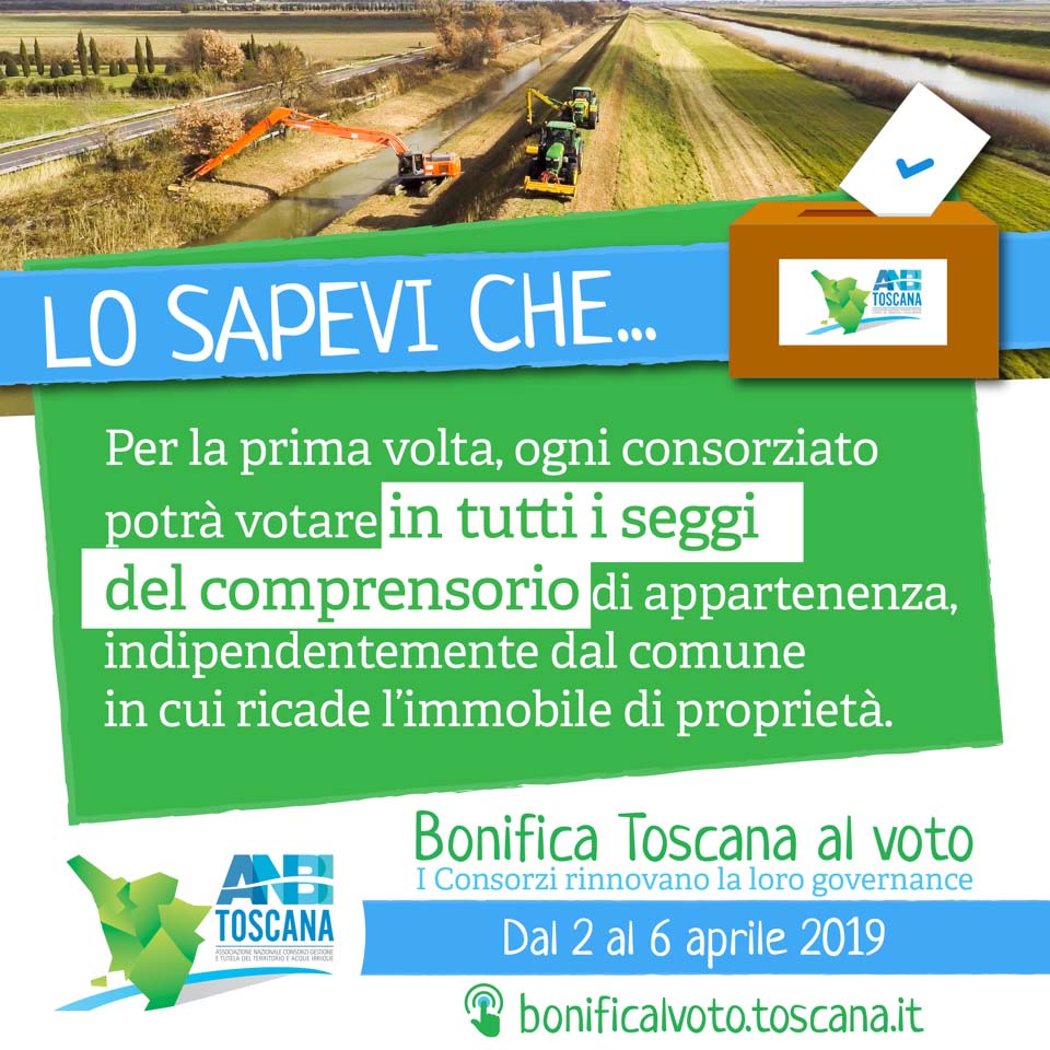 LO SAPEVI CHE… Tutte le informazioni per il voto dal 2 al 6 aprile. Per il Consorzio di Bonifica 3 Medio Valdarno consulta gli orari e i giorni di apertura dei seggi su: http://www.cbmv.it/elezioni2019/seggi