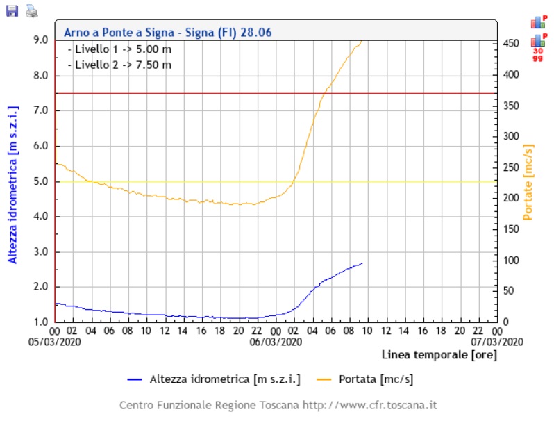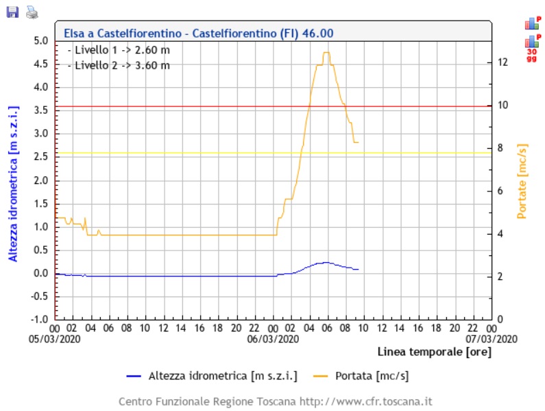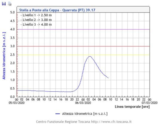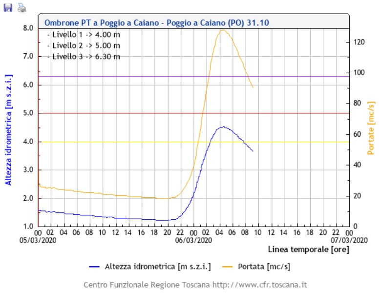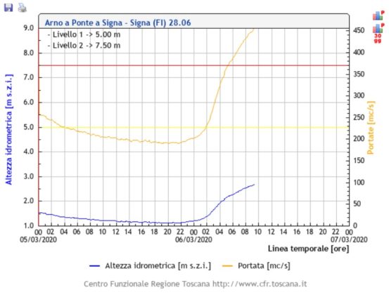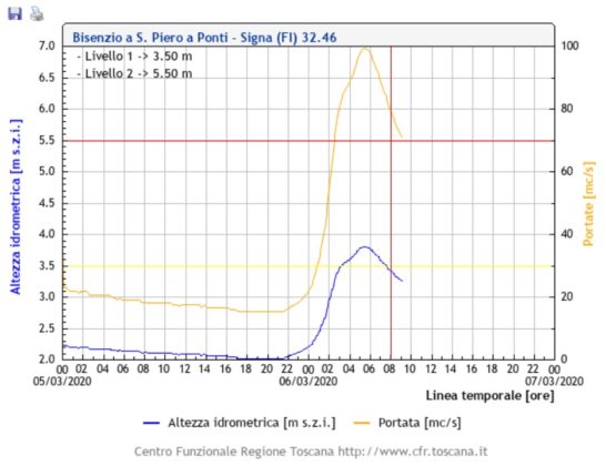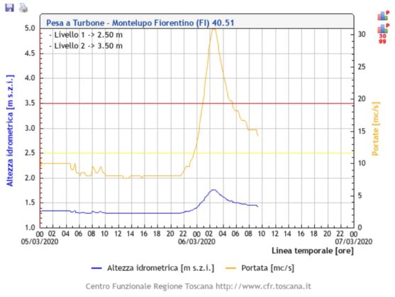 I livelli maggiori si sono registrati sui bacini in destra d’Arno (Ombrone, Bisenzio, Brana, Stella e Canali di bonifica della Piana Fiorentina e Pratese) mentre minori sono state le portate su Pesa ed Elsa ed alttri affluenti di sinistra del bacino del Medio Val d’Arno.