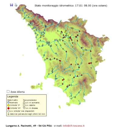 La situazione dei corsi d’acqua e delle opere idrauliche, per la quasi totalità oggetto dell’ultimo passaggio di manutenzione mediante sfalcio della vegetazione da parte del Consorzio solo qualche settimana fa prima dell’inizio del periodo piovoso degli ultimi giorni, è rimasta per tutta la giornata del 17 degna di grande attenzione come evidenziato dalla mappa del Centro Funzionale della Regione Toscana con diverse stazioni idrometriche rimaste a lungo colorate di rosso nei luoghi in cui si sono registrate ondate di piena oltre il secondo livello di allerta.