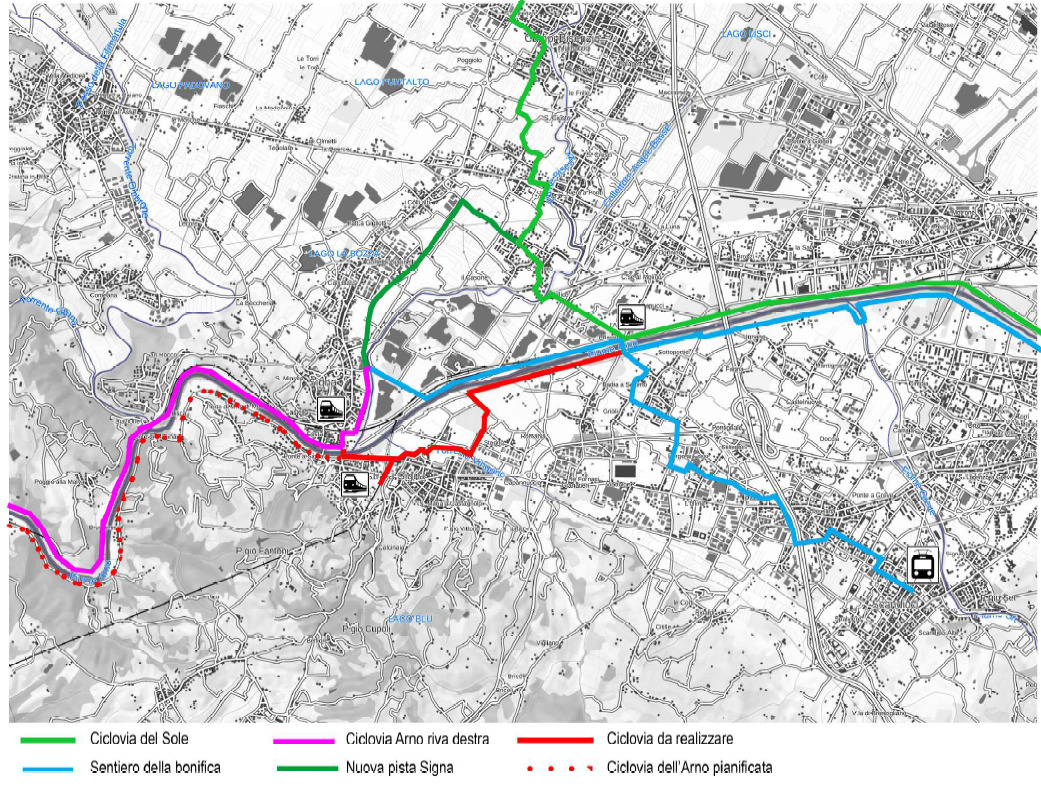Tale progetto tiene conto sia dell’aspetto ciclo-turistico che l’importanza del collegamento fra agglomerati urbani del bacino dell’Arno e fra di essi e le stazioni ferroviarie.