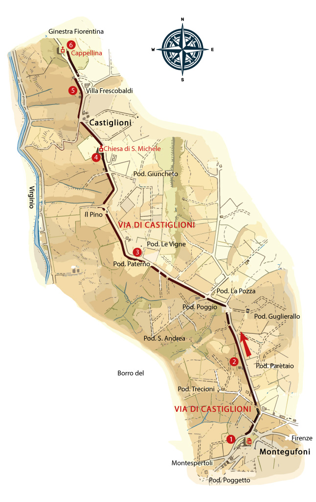 La Via di Castiglioni è un invito alla lettura e alla comprensione di un paesaggio in continua trasformazione, in relazione all’uso fatto dalle varie comunità umane che lo hanno abitato nel corso del tempo. Il percorso inizia dal ponticino sul borro del Boscone, dove un cippo commemora il partigiano Settimo Agostini. Da qui, si snoda attraverso una collina quasi piatta, offrendo una straordinaria visibilità su coltivi, boschi e emergenze storico-architettoniche fino a raggiungere la Cappellina presso la Villa Frescobaldi.